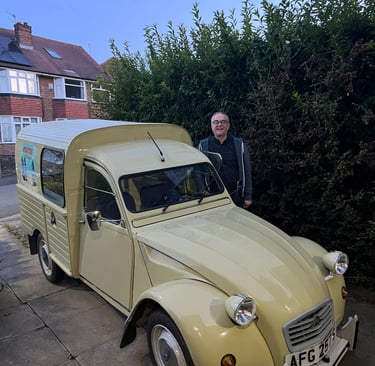 In August 2023 Jonathan contacted me to see if I might be interested to know that one of his customers with a good looking AK400 was considering selling. I looked at the images and thought there was no harm in going to view it – travelling up to Pontefract in West Yorkshire one evening. I immediately fell for Pastis the AK400, he was in extremely good condition, having had a thorough restoration in 2012. The owner prior to Leo the vendor had been the 2CVGB Van Registrar and that gave me a great deal of confidence in the quality of the vehicle. Leo had also carried out a full rewire and cared for the van very well.