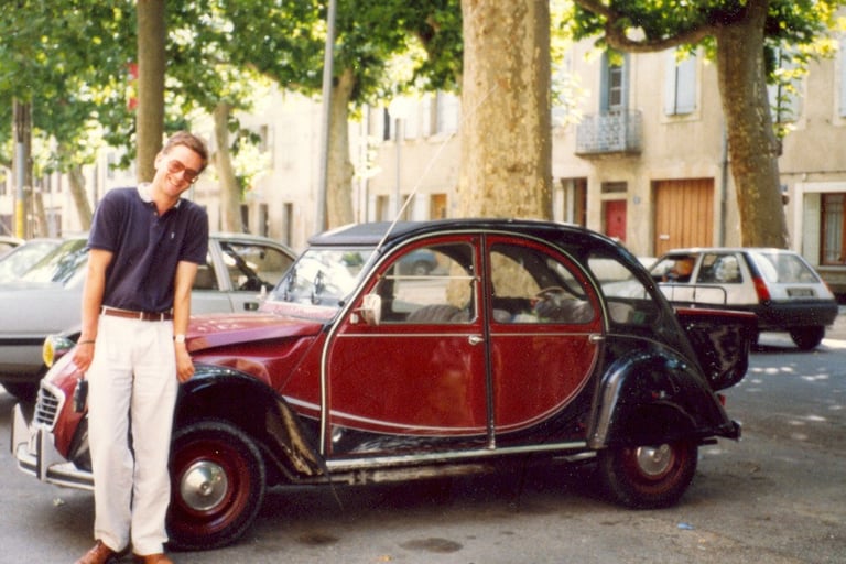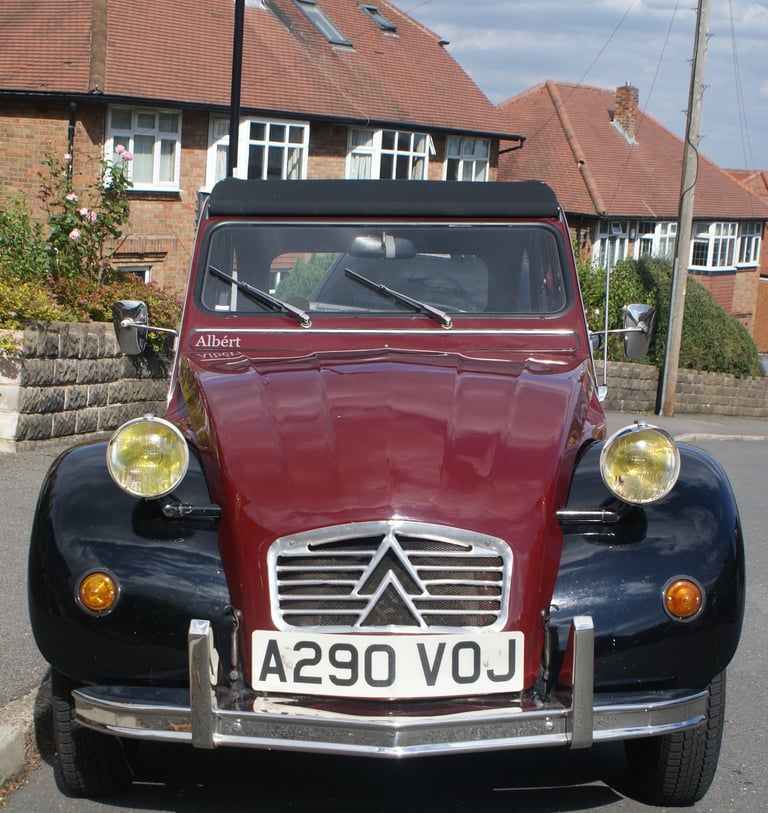 ...for some inconceivable reason I decided that I would go for a more modern car (the 2CV had been launched in 1948). I settled on a lovely blue Mini Metro named Mille. Busby was sold and I even sold my boot extension to a member of the Kursaal Flyers. Yes, it was all a big mistake. Millie had the optional garden pond in the passenger footwell and collapsing suspension. Not a good move. Within a year I had purchased my second 2CV, a lovely black and maroon Charleston (B179YFC) quickly named Maigret. Maigret rapidly clocked up the miles, travelling all over the country and then transporting my girlfriend (now wife) and I around France for our first European holiday. It was a great trip despite needing a replacement amortisseur avant when visiting Carcassonne and I achieved one of my ambitions, driving around the Arc de Triomphe – even if it was a Sunday! When we got married in 1991 we both traded in our cars (the other being a Mini Mayfair) and purchased a Citroen AX.